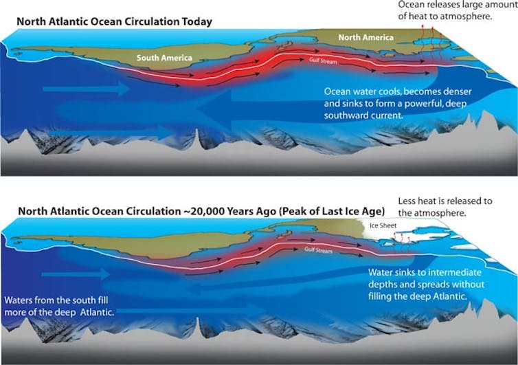 La fuerza y extensión vertical de la cinta transportadora global del Atlántico no siempre ha sido la misma. Los indicadores paleoceanográficos en sedimentos indican que hace unos 20 000 años la cinta transportadora del Atlántico Norte era mucho más débil y menos profunda. Como consecuencia, el transporte de calor hacia altas latitudes era menor y la Tierra experimentó un máximo glacial.