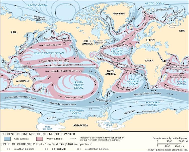 Pero igualmente importante es la transferencia de calor desde los trópicos hacia altas latitudes, que ocurre gracias a los vientos atmosféricos y las corrientes oceánicas. En el océano esto queda determinado por la intensidad de la cinta transportadora global y del circuito termoclino.